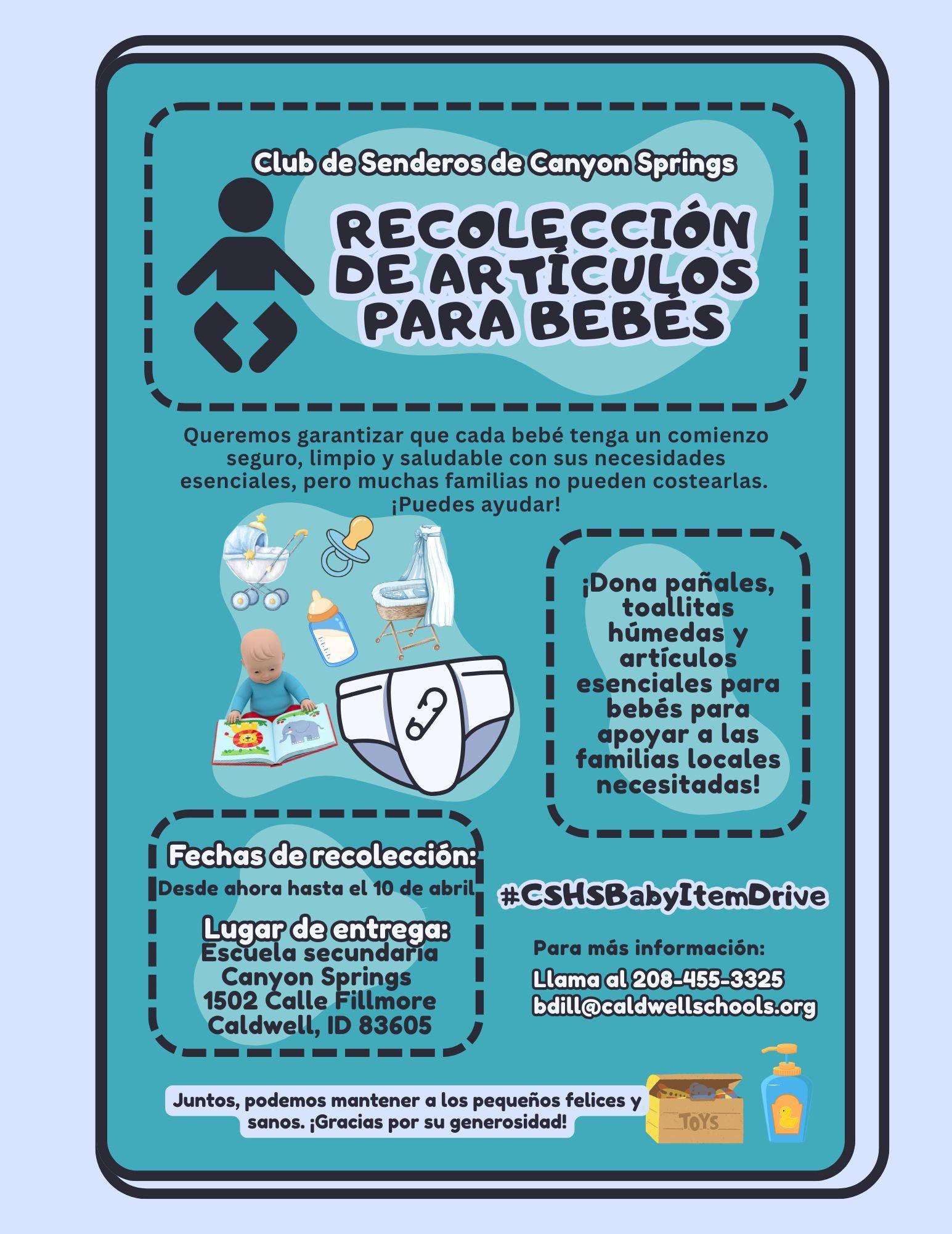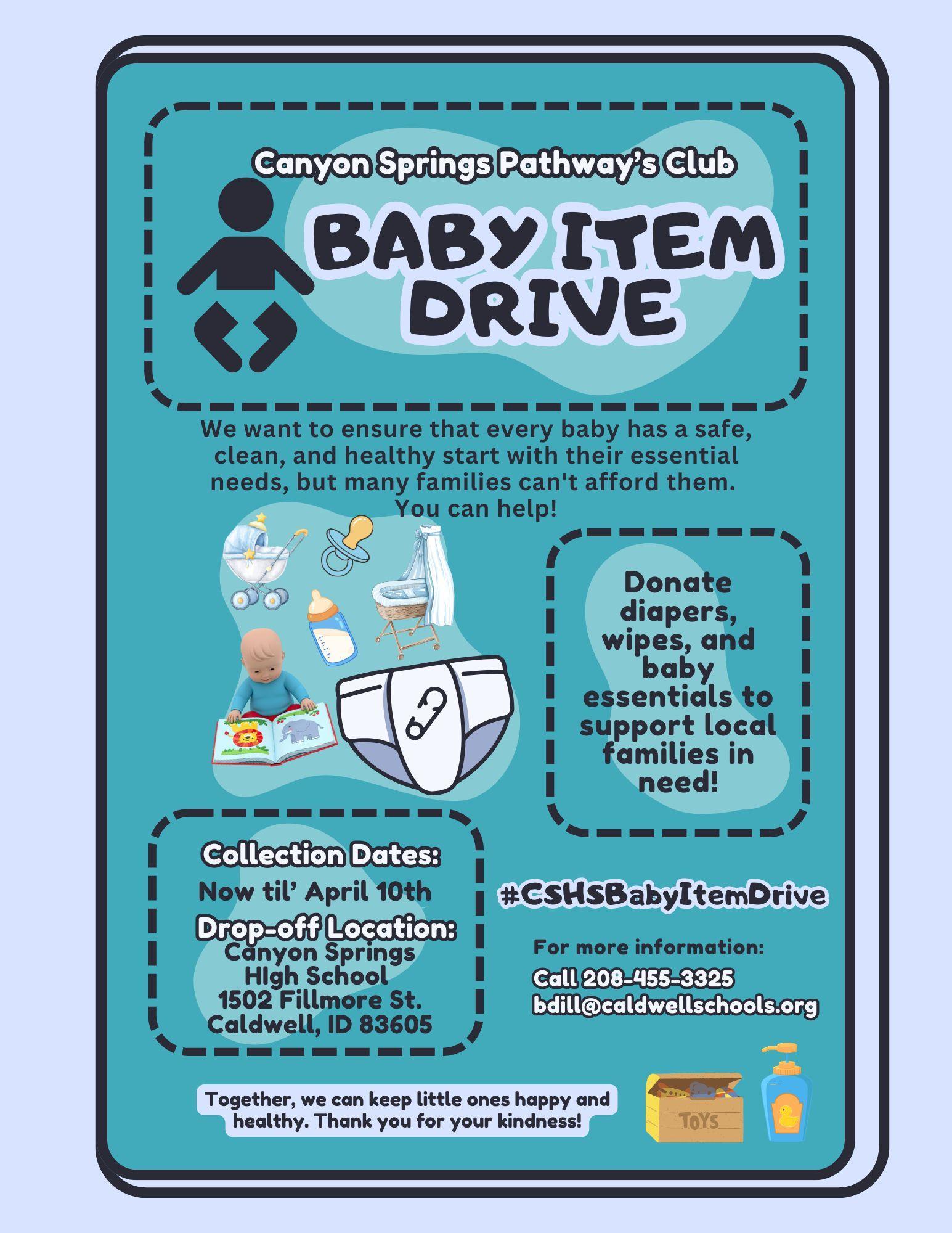 The Canyon Springs Pathway’s Club is hosting a Baby Item Drive, and we need your help to support families in our community. Every baby deserves to be safe, clean, and healthy—let’s come together to make that happen!